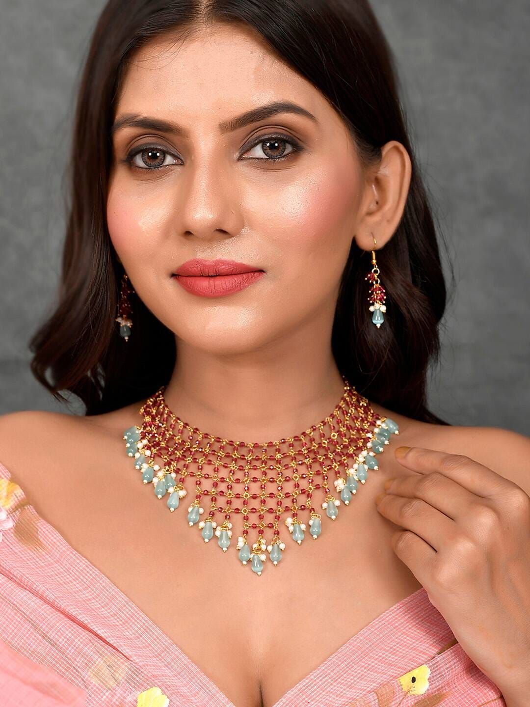 Gold Plated Stones Studded & Beaded Jewellery Set