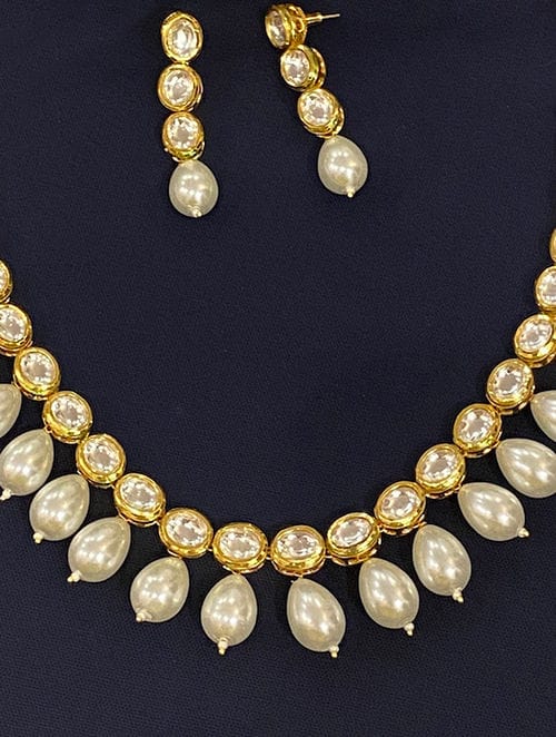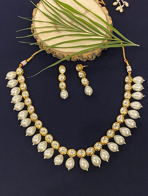 Gold Plated Pearl Studded Choker Necklace & Earrings Set