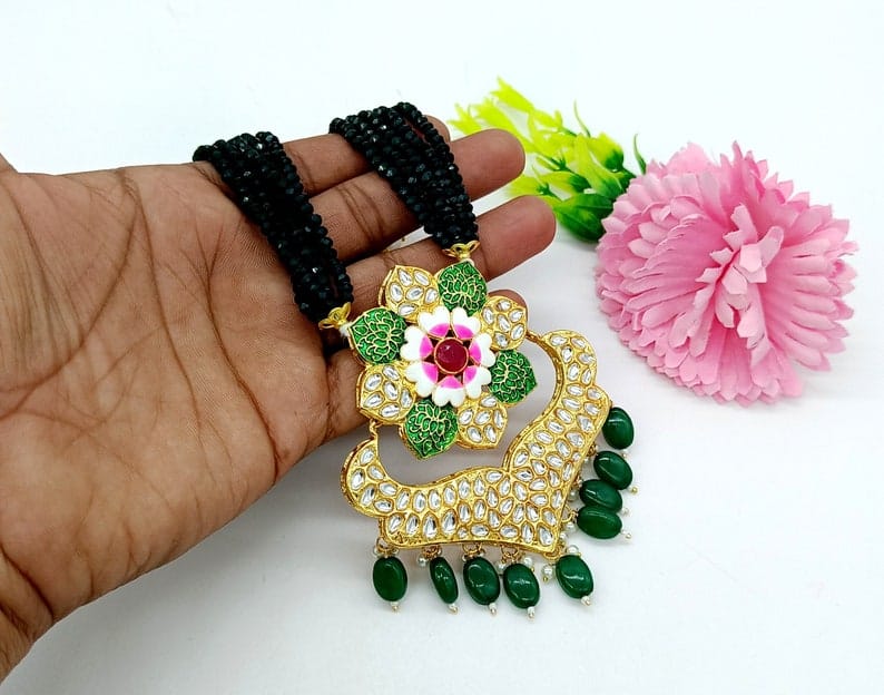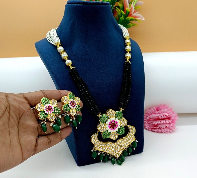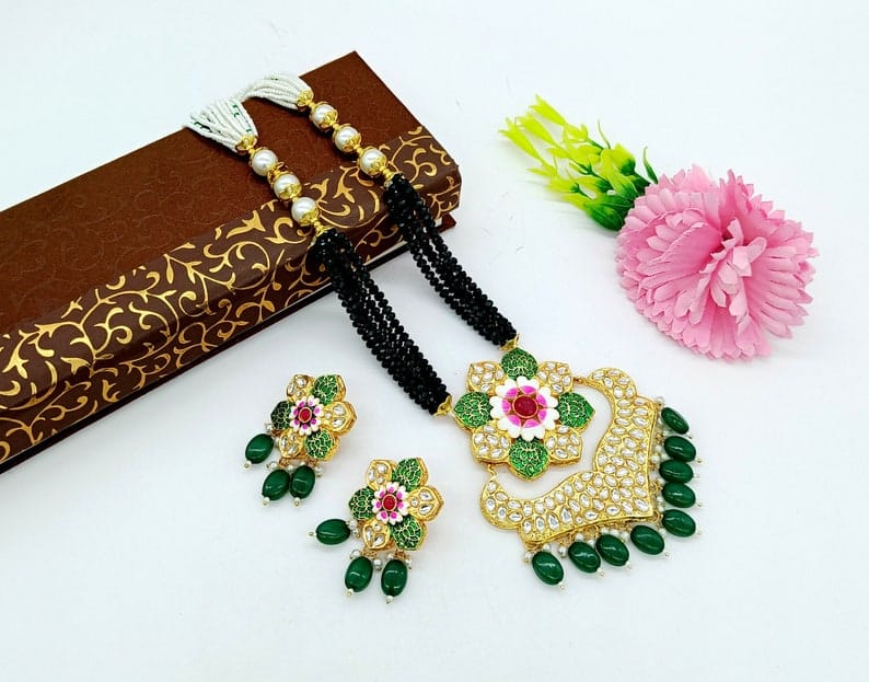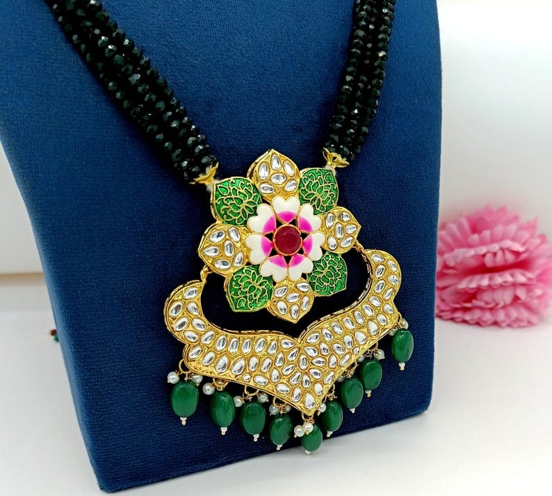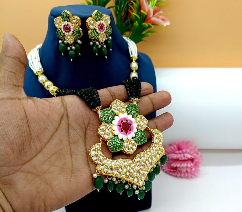 Heavy Meenakari Kundan With Emarald Green Drop Stone Necklace