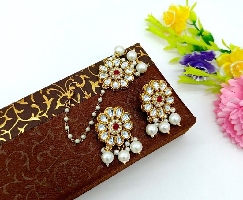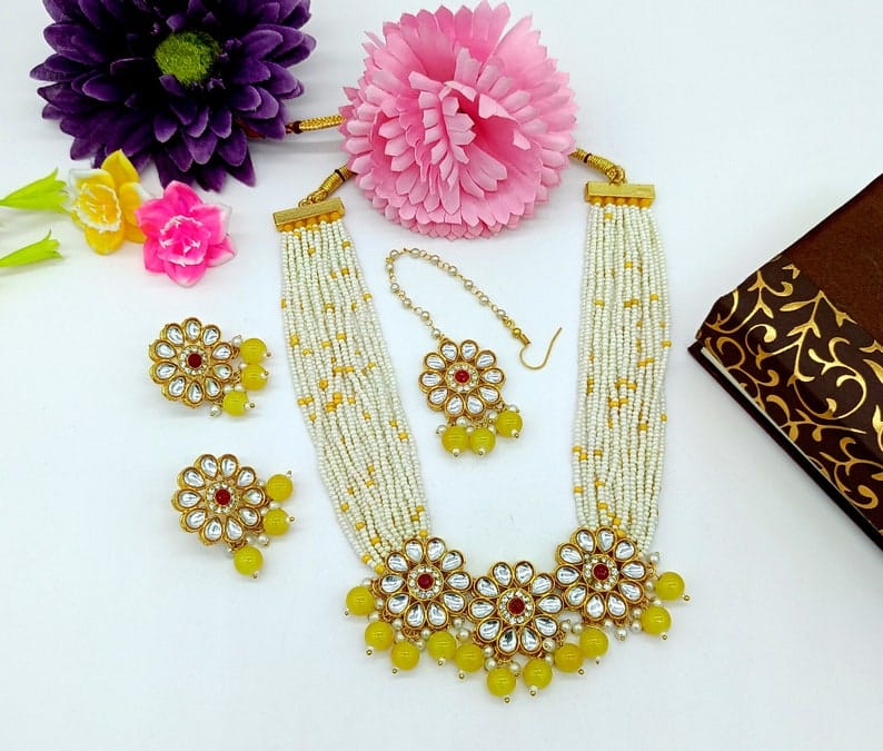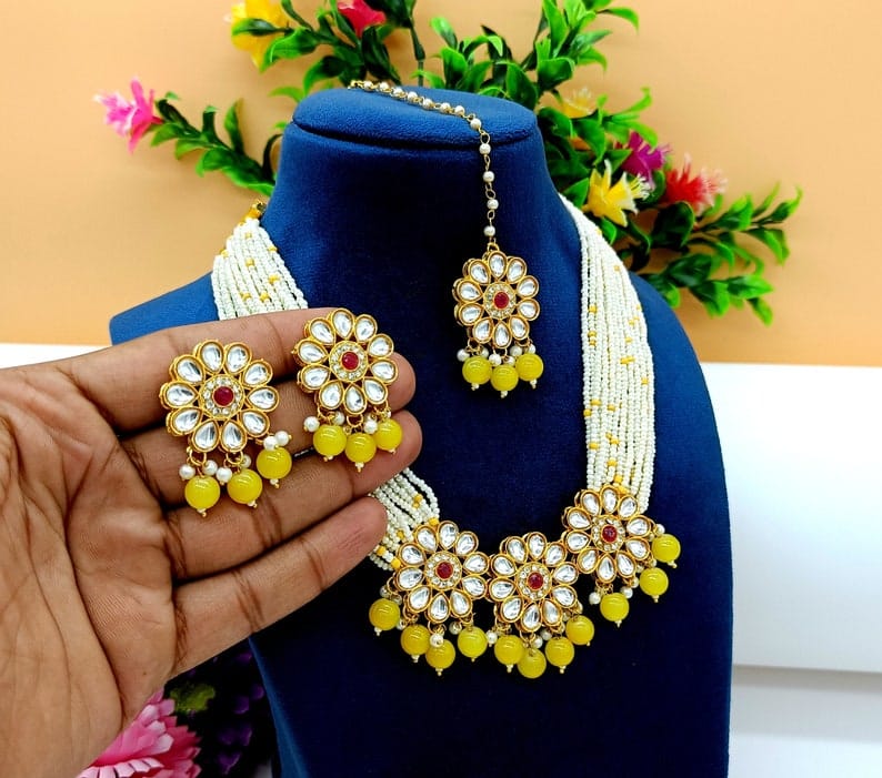 Designer Pearl Beaded Kundan Choker Necklace With Earrings