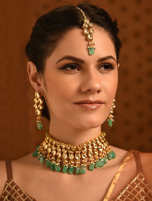 Gold Plated Stones Studded & Beaded Jewellery Set