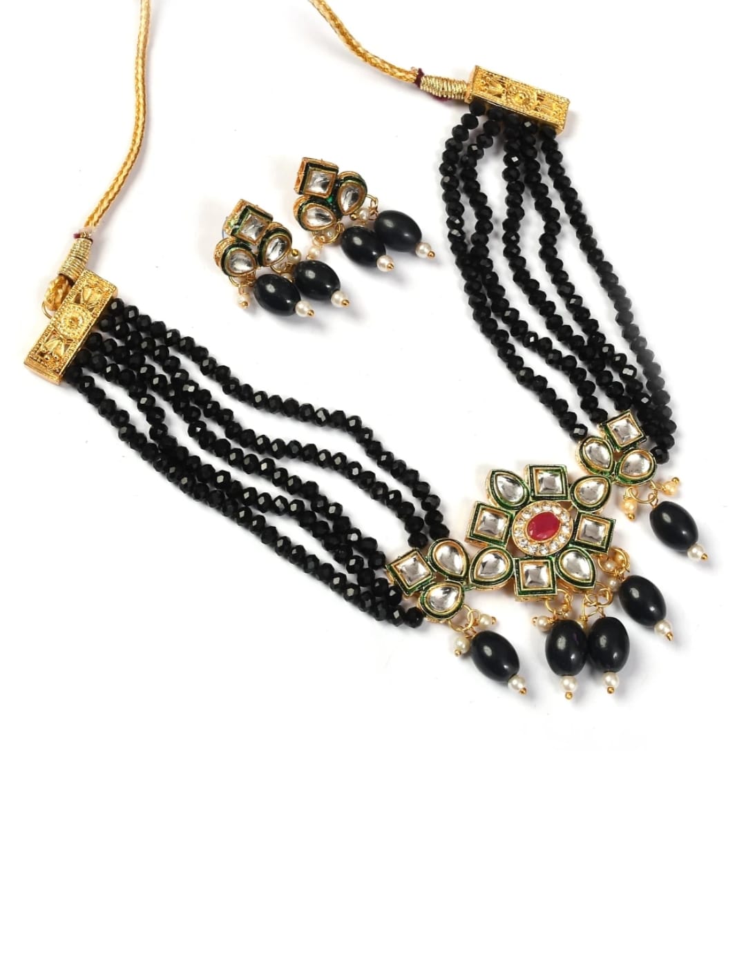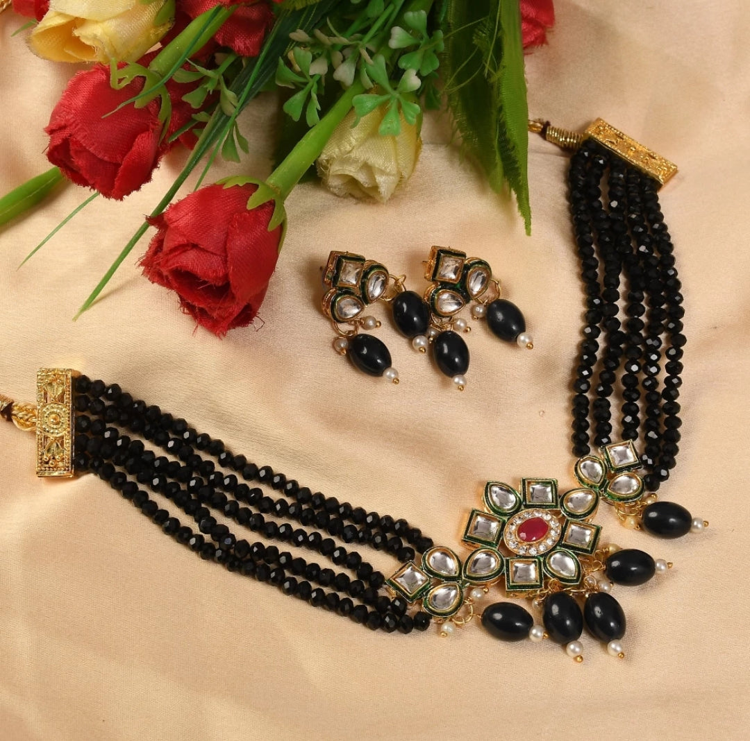 Gold Plated Stones Studded & Beaded Jewellery Set