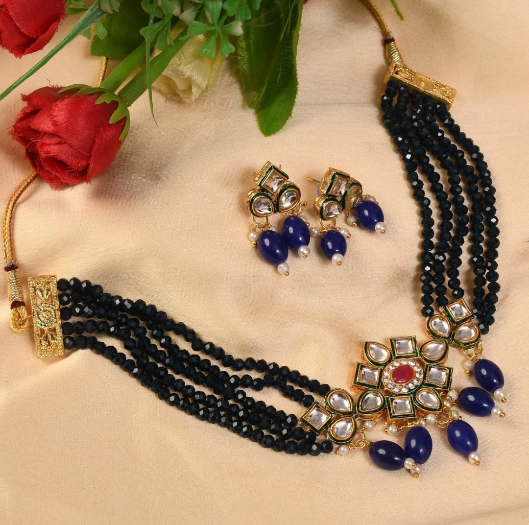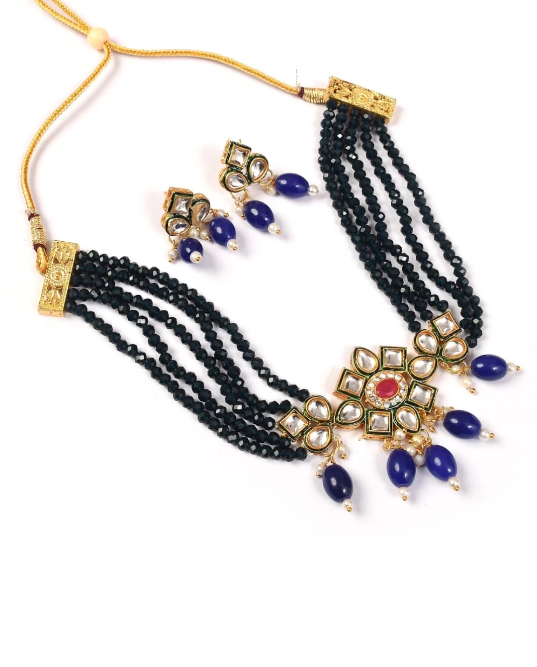 Gold Plated Stones Studded & Beaded Jewellery Set