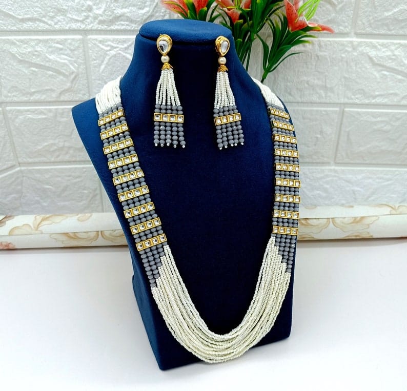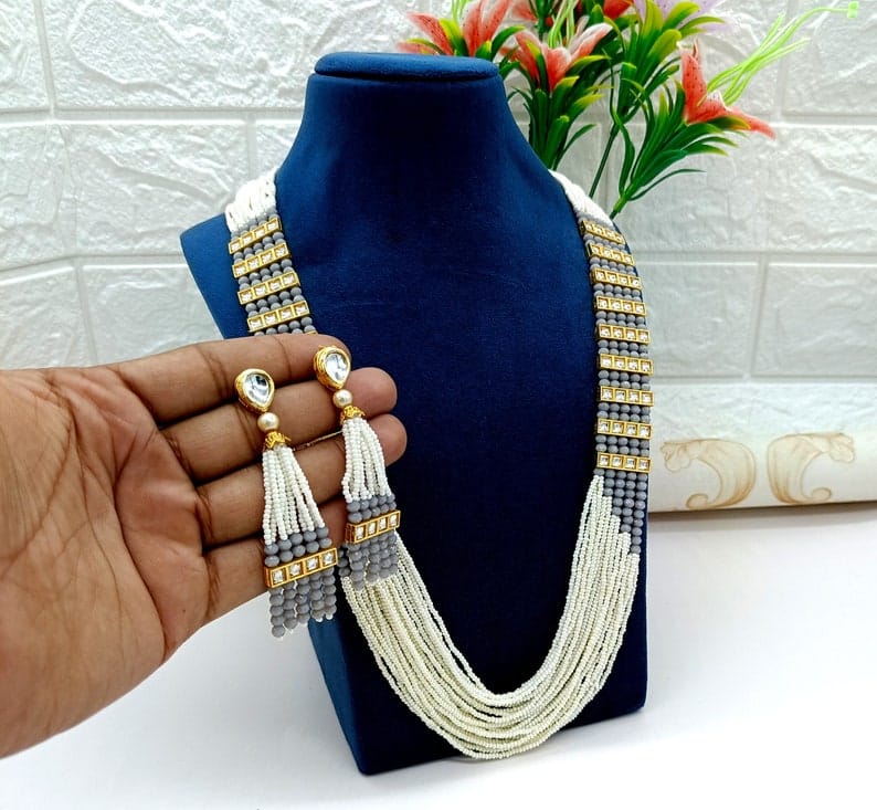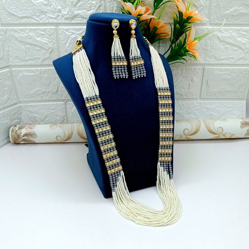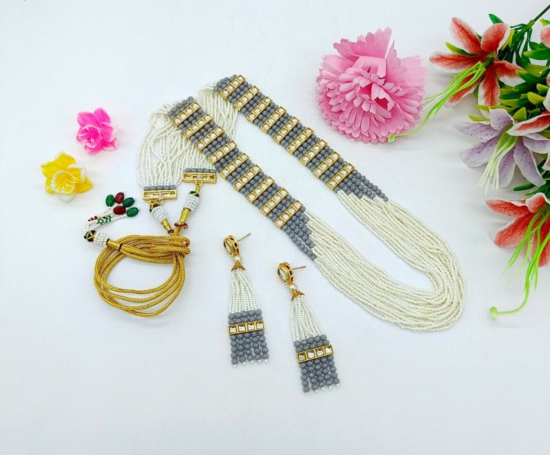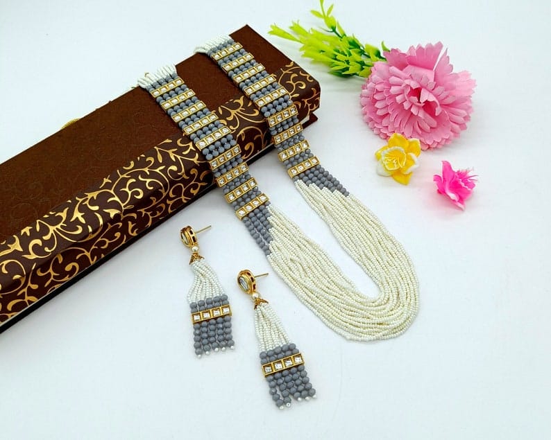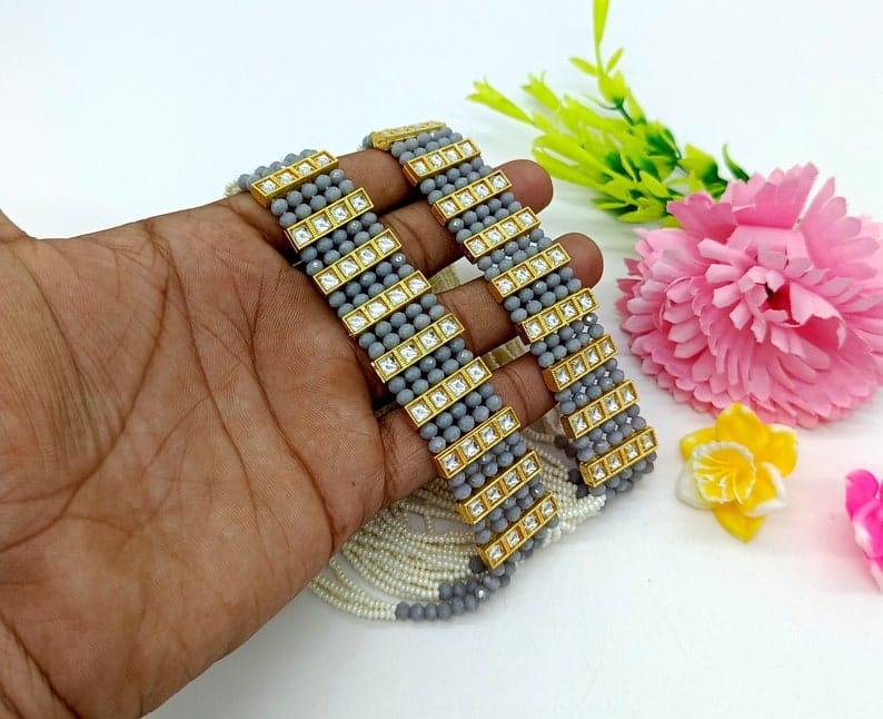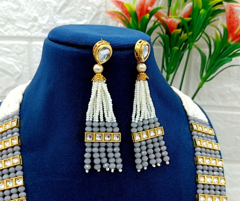 Designer Pearl Beaded Kundan Choker Necklace With Earrings