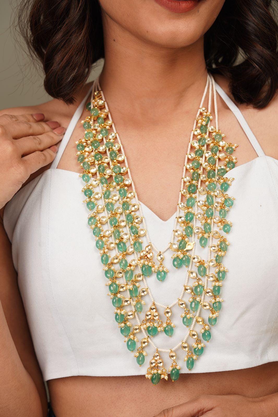 Green Fresh Water Pearls Stones Embellished Multi Layered Necklace
