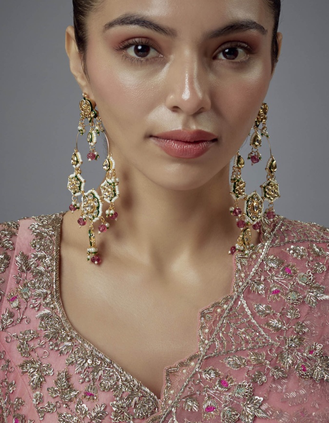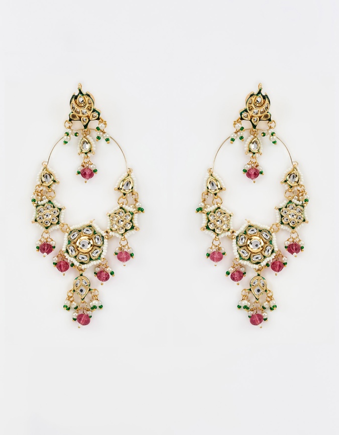 Gold Finish Green Kundan Polki & Pearl Jhumka Earrings