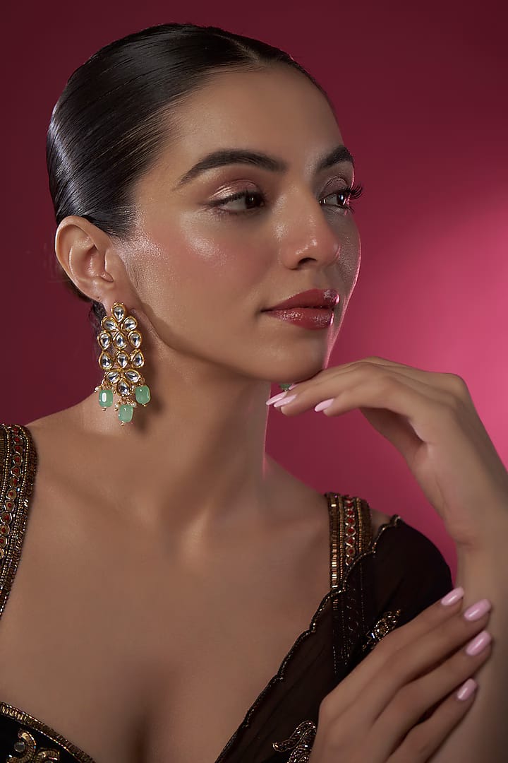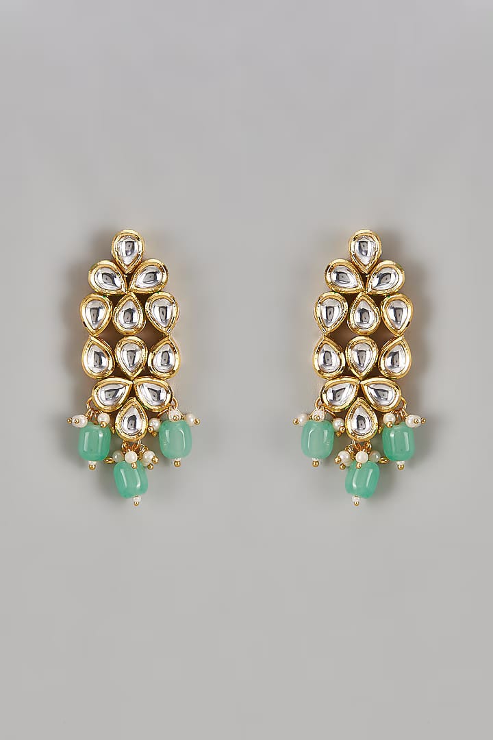 Gold Finish Kundan Polki & Mint Green Stone Dangler Earrings
