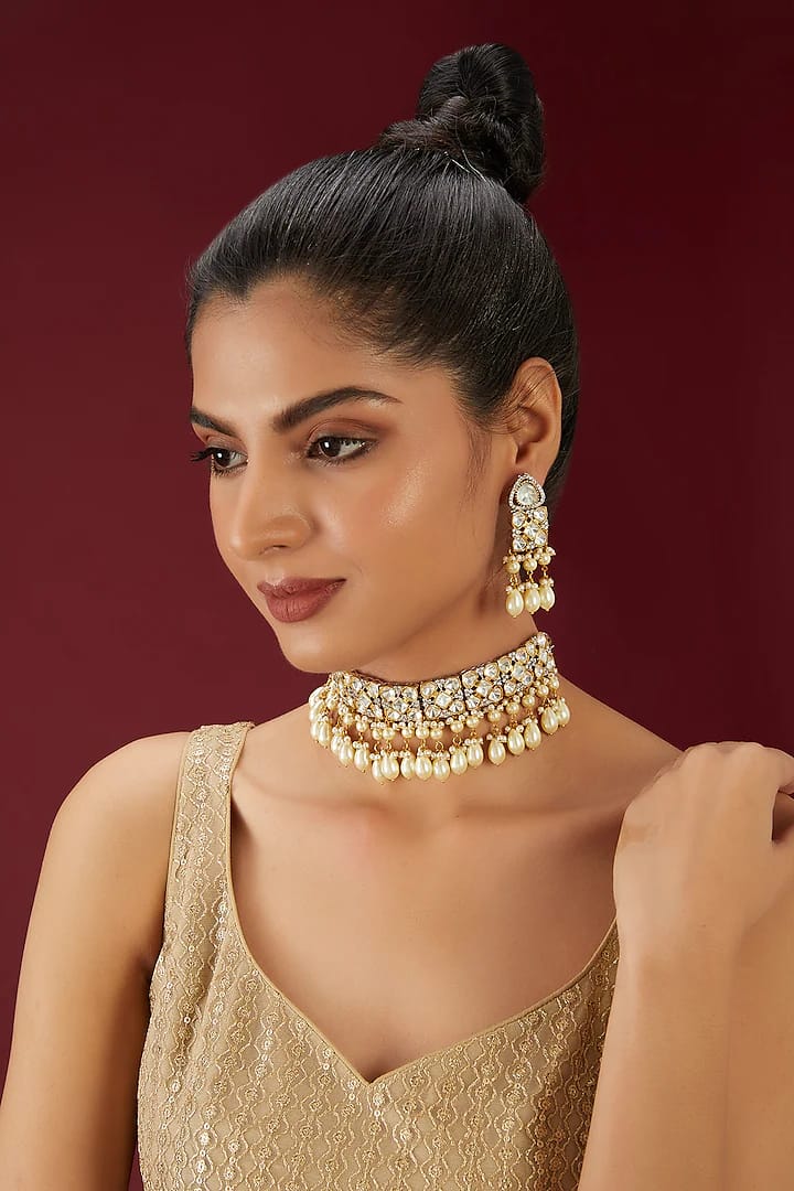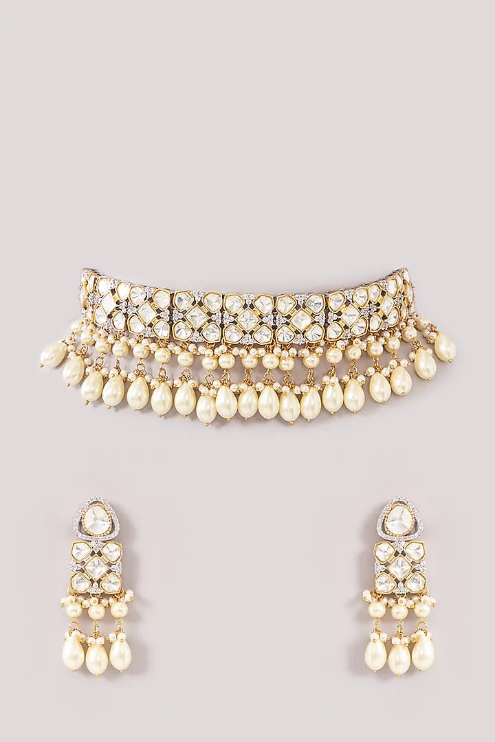 Gold Finish Kundan Polki & Pearl Choker Necklace Set