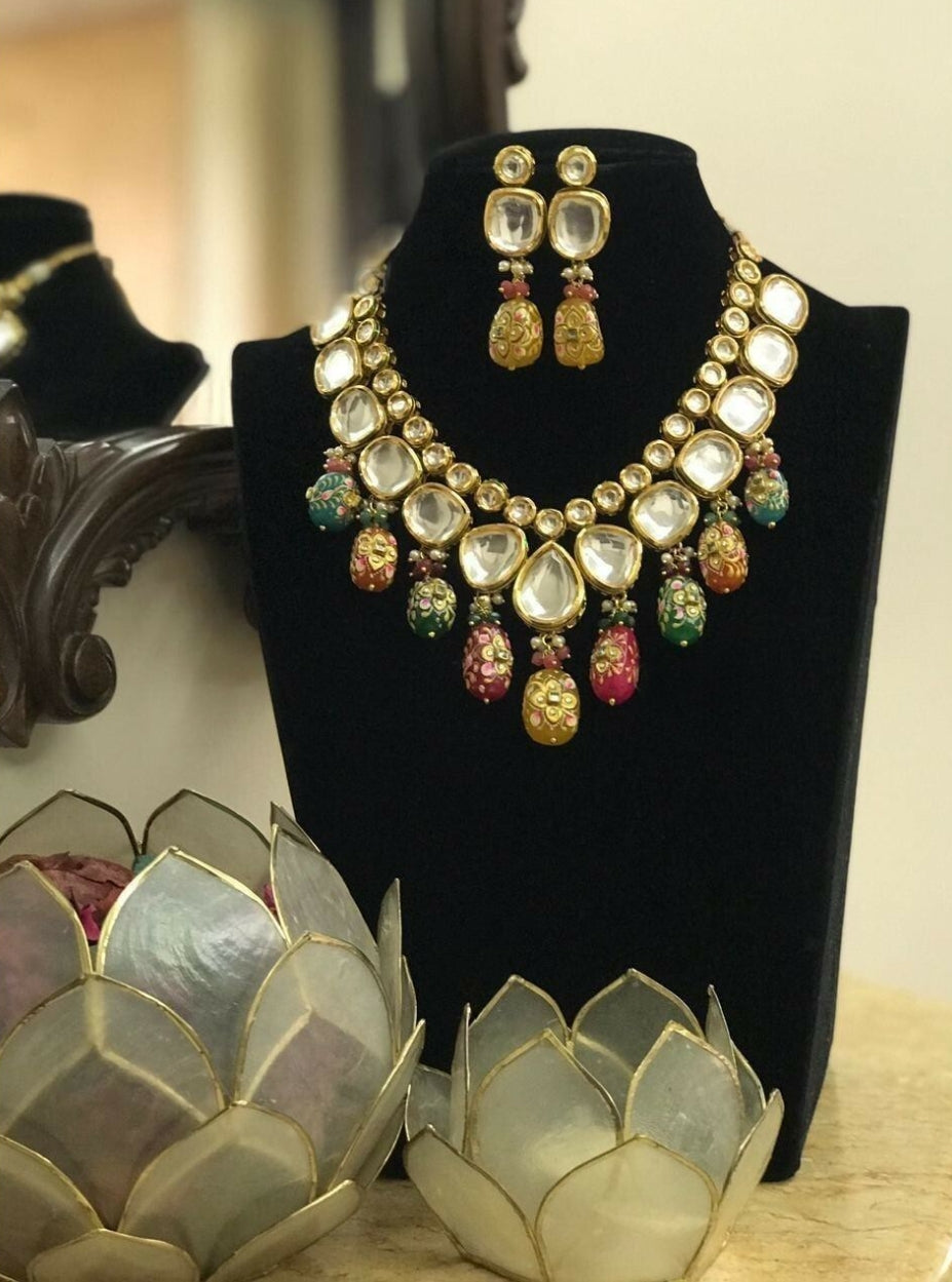 Heavy Meenakari Kundan With Emarald Green Drop Stone Necklace
