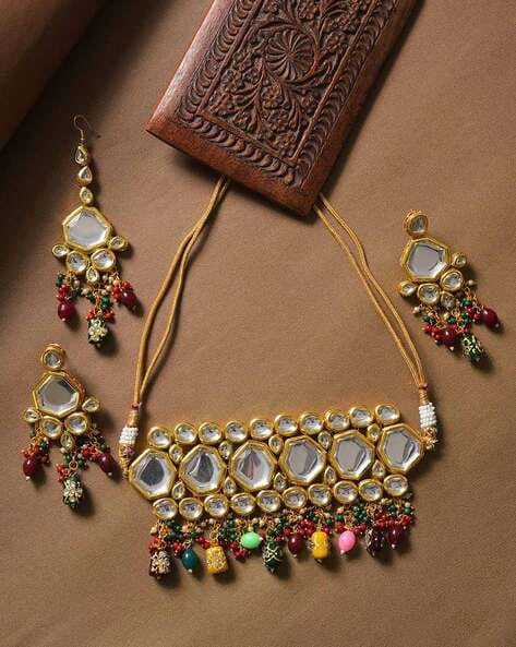 Gold Plated Stones Studded & Beaded Jewellery Set