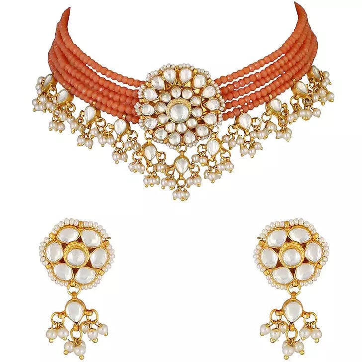 Designer Pearl Beaded Kundan Choker Necklace With Earrings