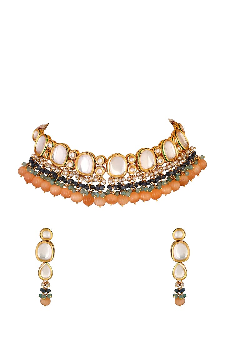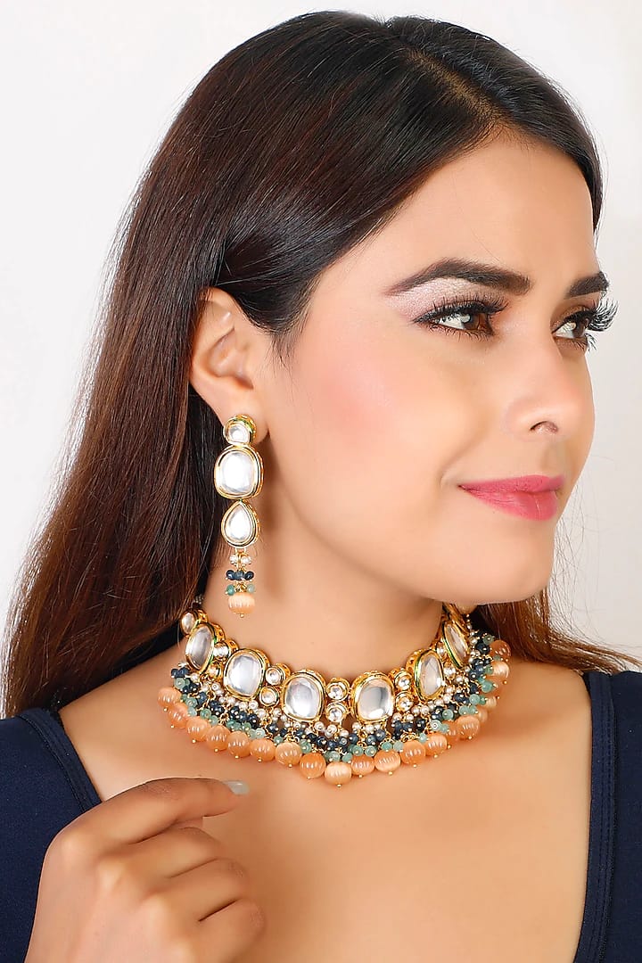 Gold Plated Stones Studded & Beaded Jewellery Set