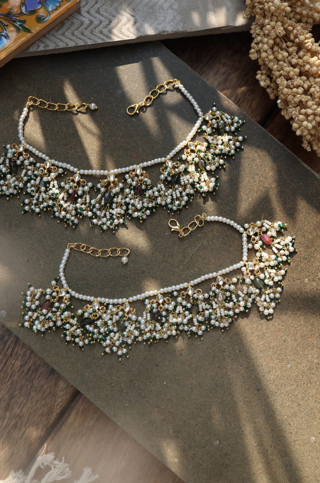 Gold Plated Kundan Polki & Pearl Anklets (Set of 2)