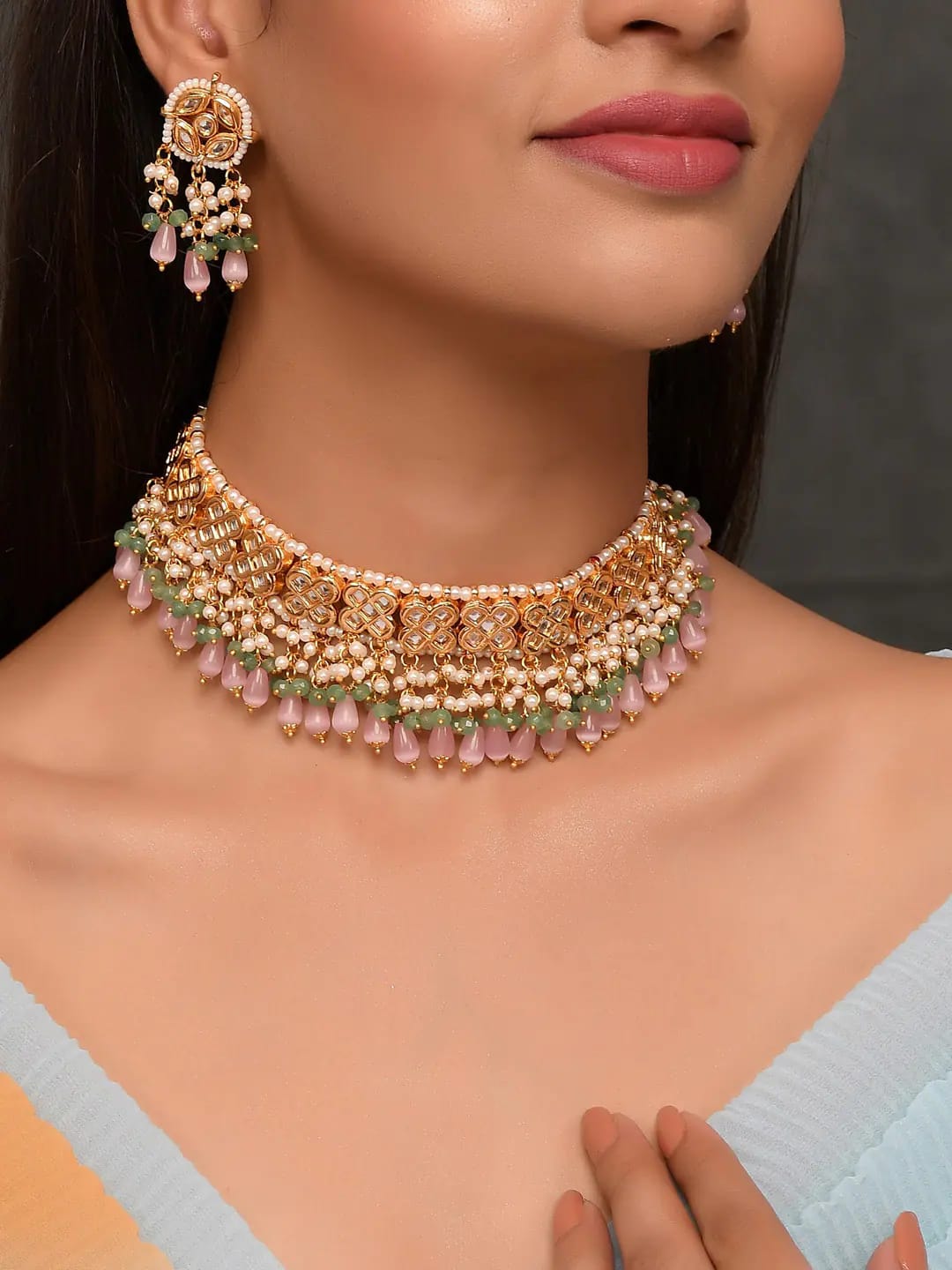 Green Fresh Water Pearls Stones Embellished Multi Layered Necklace
