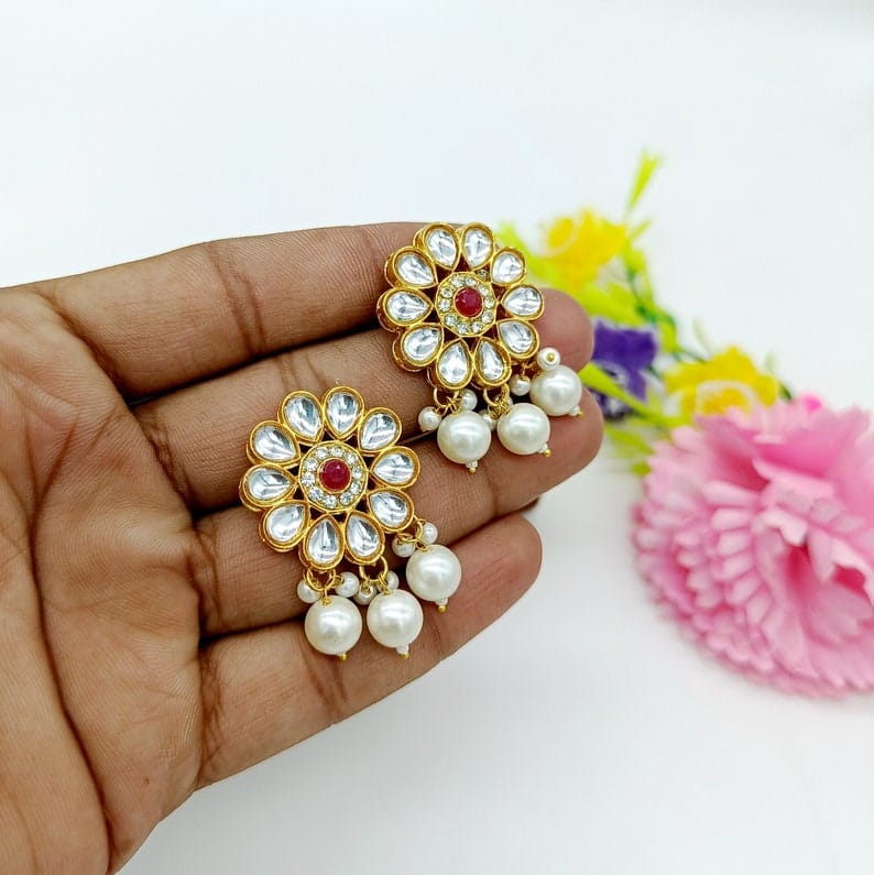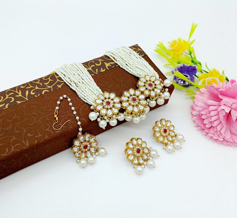 Designer Pearl Beaded Kundan Choker Necklace With Earrings