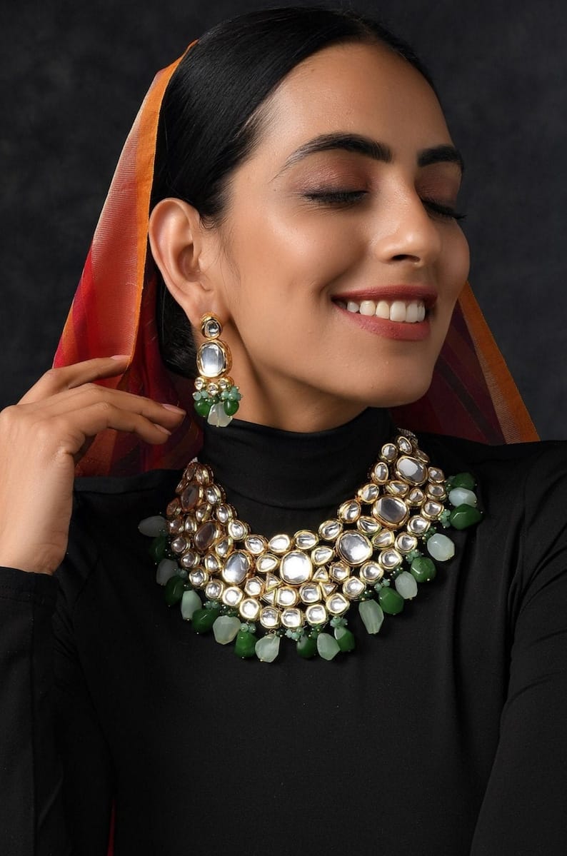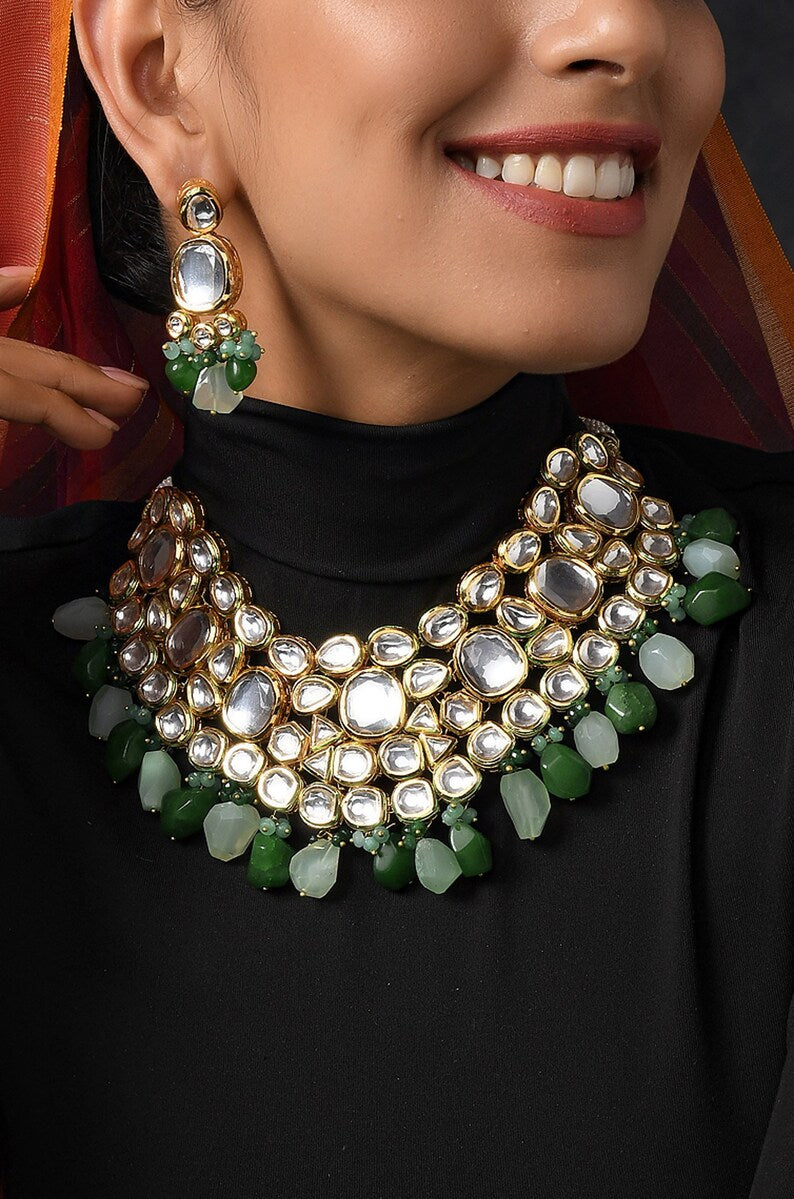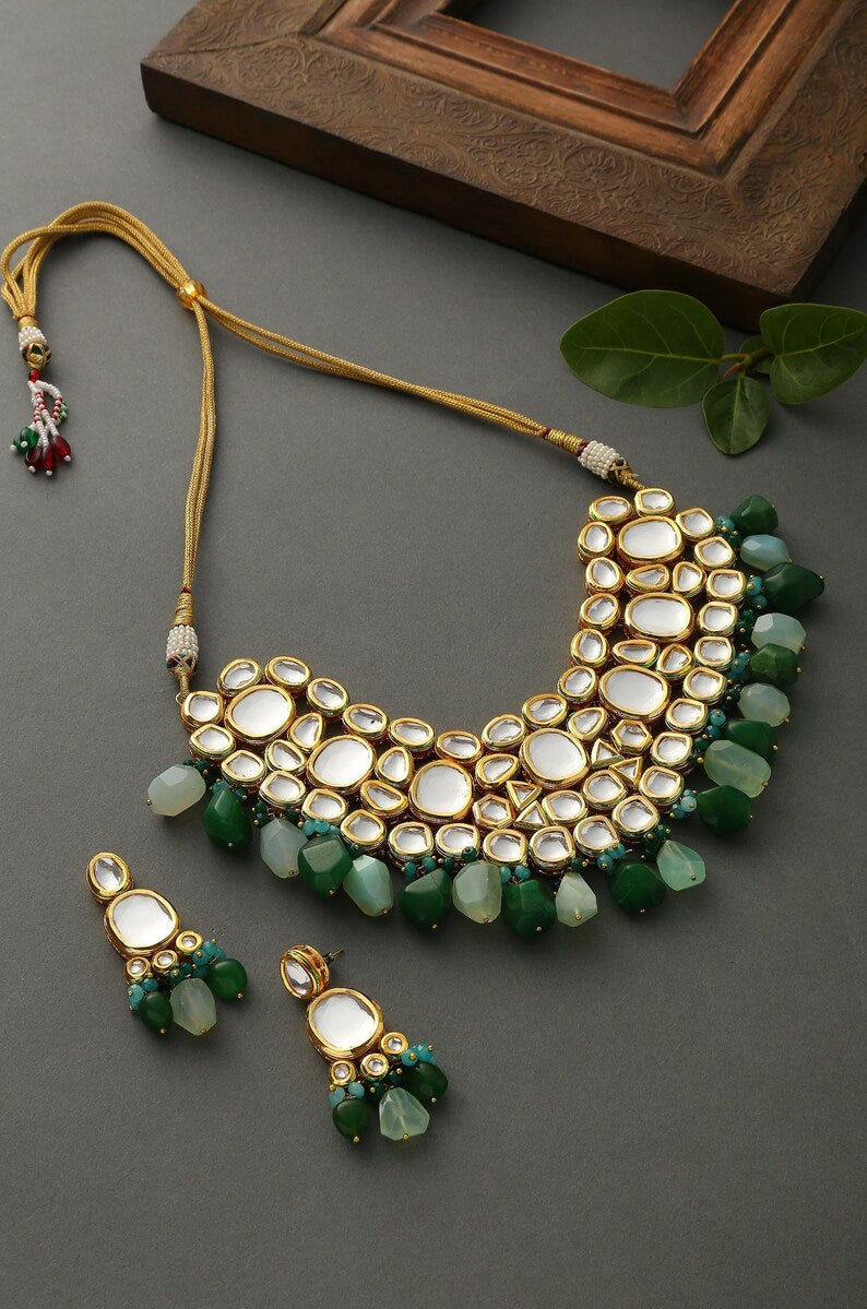 Gold Plated Stones Studded & Beaded Jewellery Set