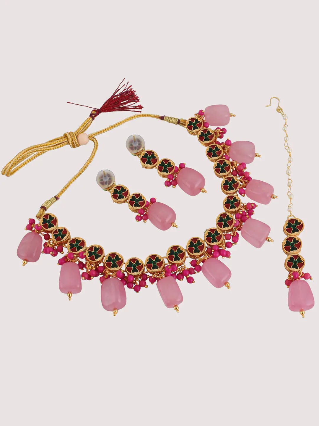 Gold Plated Stones Studded & Beaded Jewellery Set