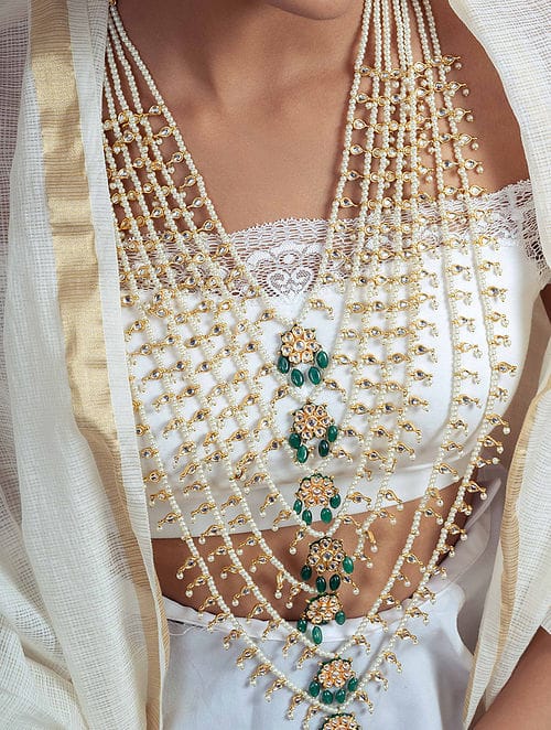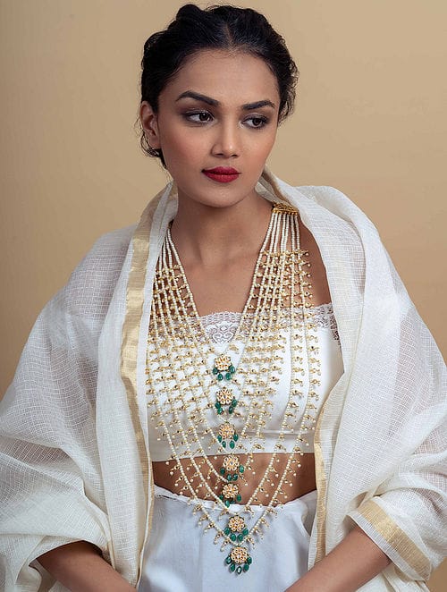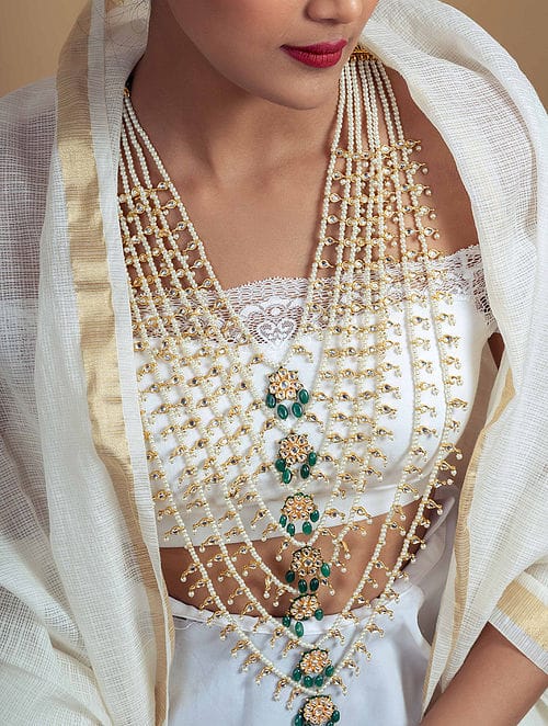 Green Fresh Water Pearls Stones Embellished Multi Layered Necklace