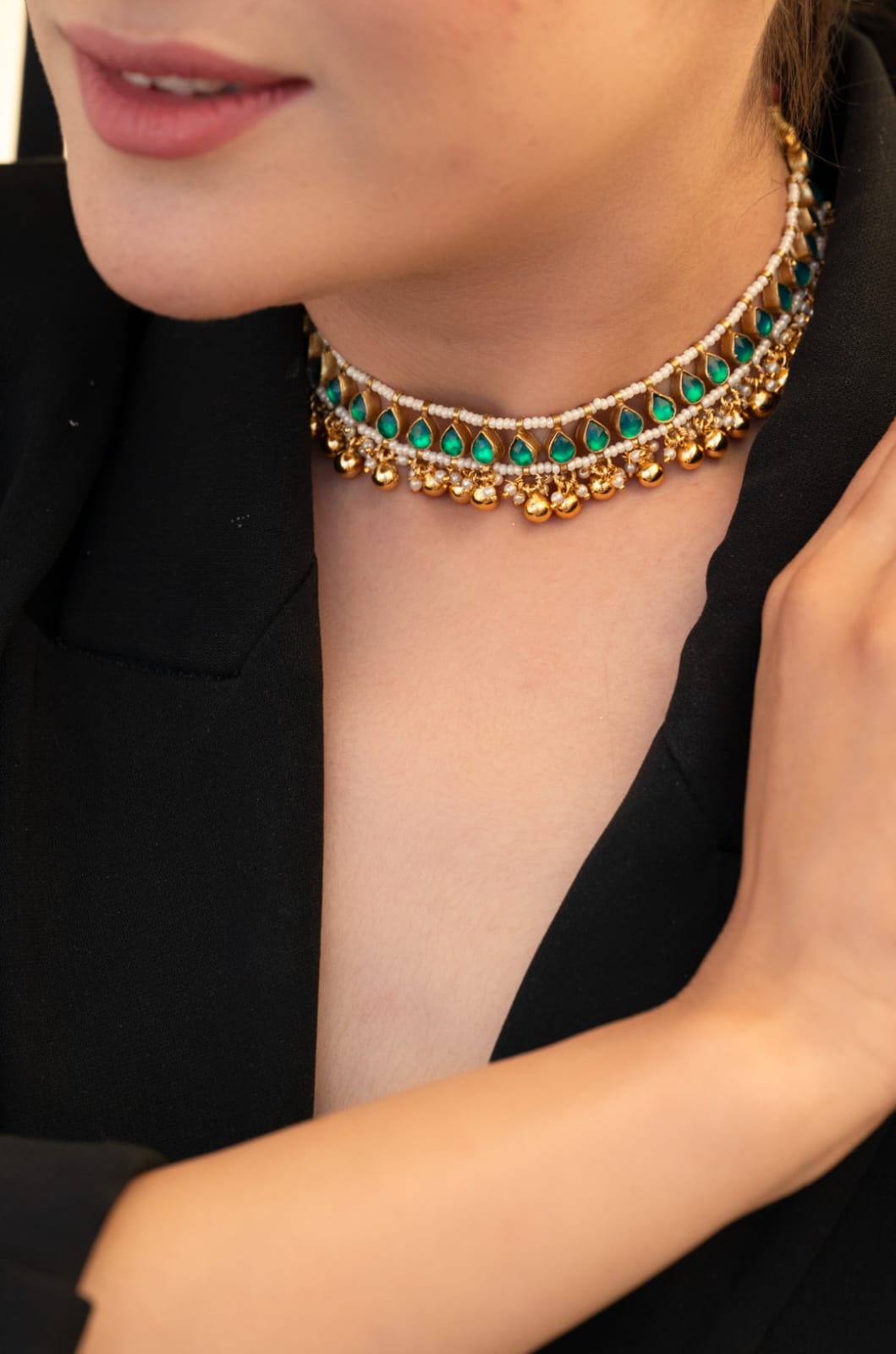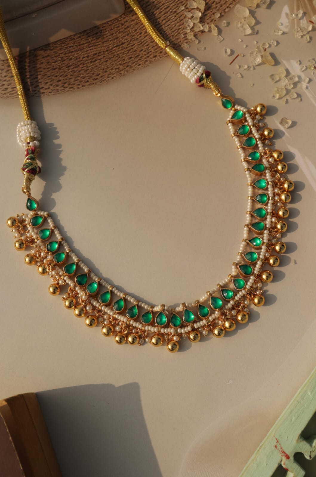 Green Pearls Kundan Drop Embellished Necklace Set
