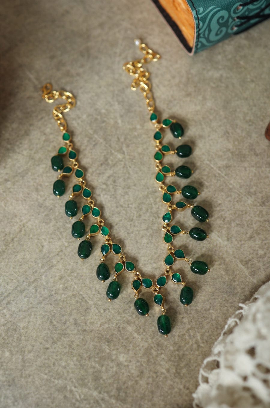 Gold Finish Kundan Necklace Emerald Green Mala