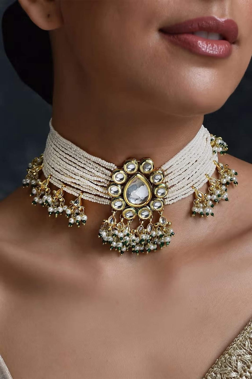 Gold Plated Pearl Studded Choker Necklace & Earrings Set