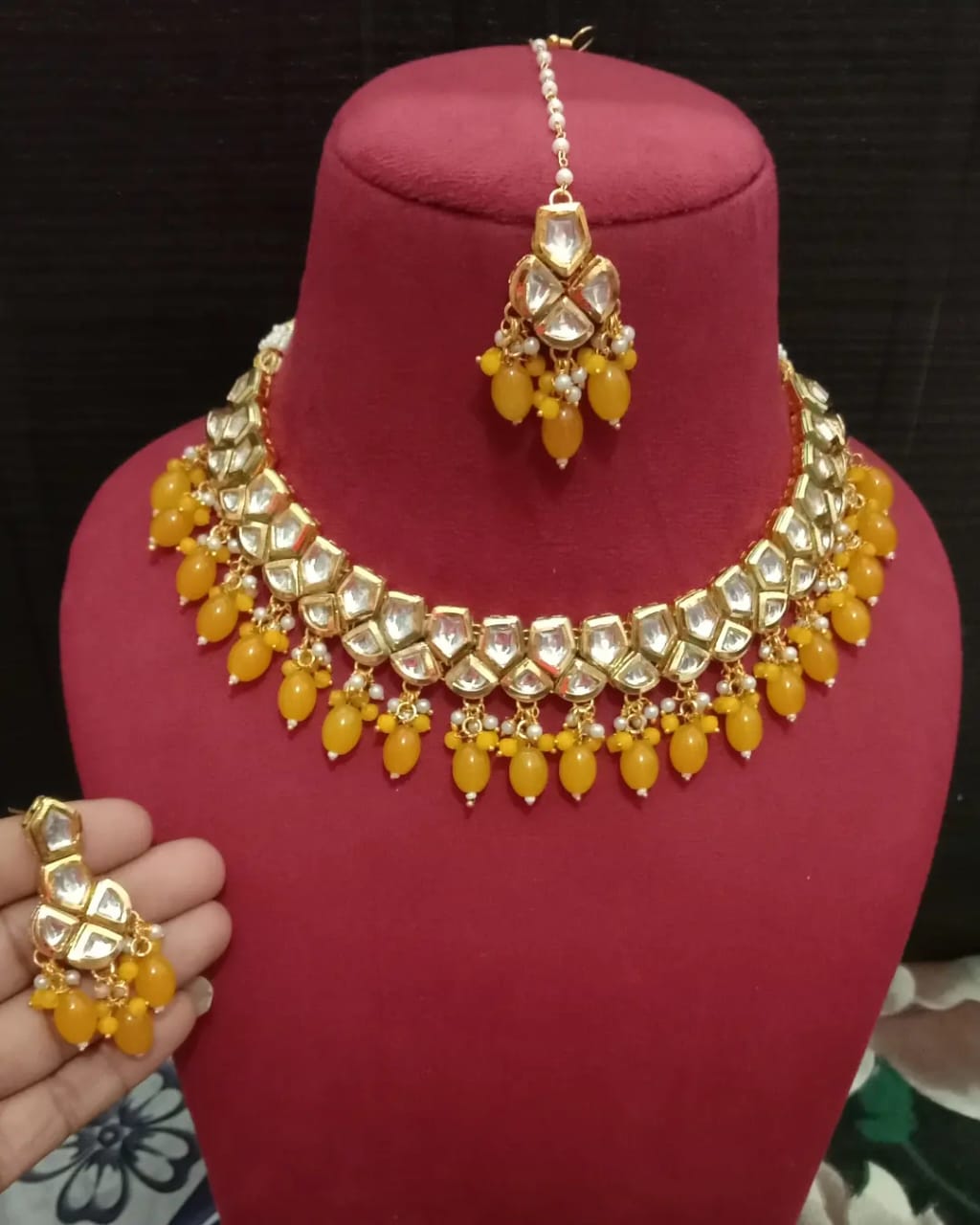Gold Plated Stones Studded & Beaded Jewellery Set