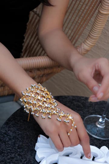 Gold Finish Kundan Polki & Pearl Haath Phool (Set Of 2)
