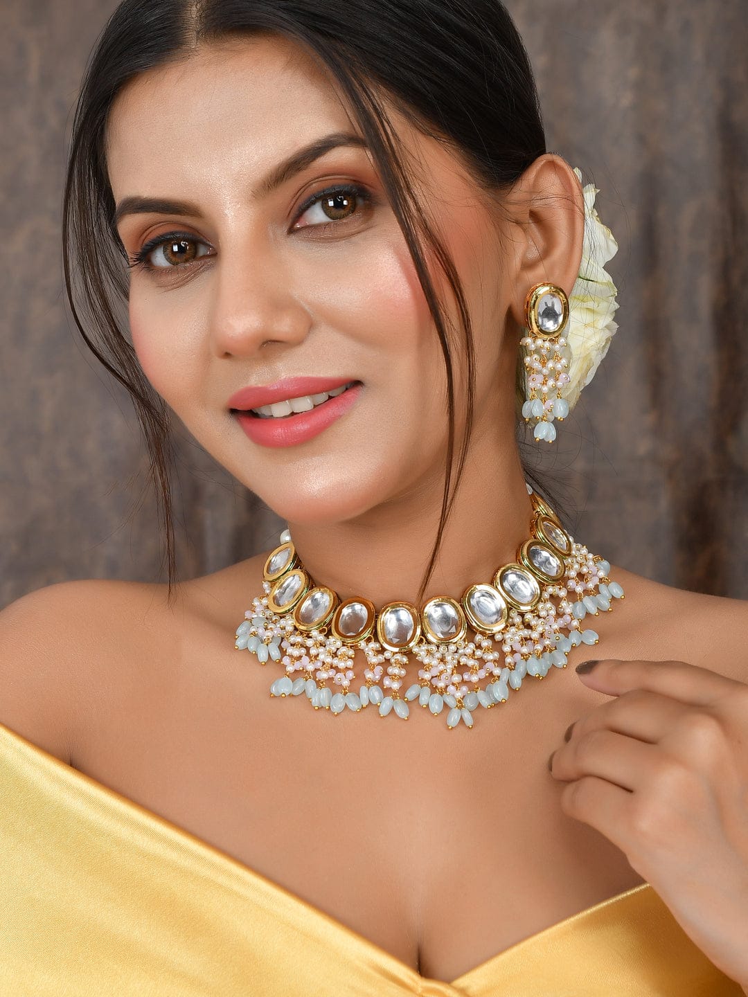 Designer Pearl Beaded Kundan Choker Necklace With Earrings