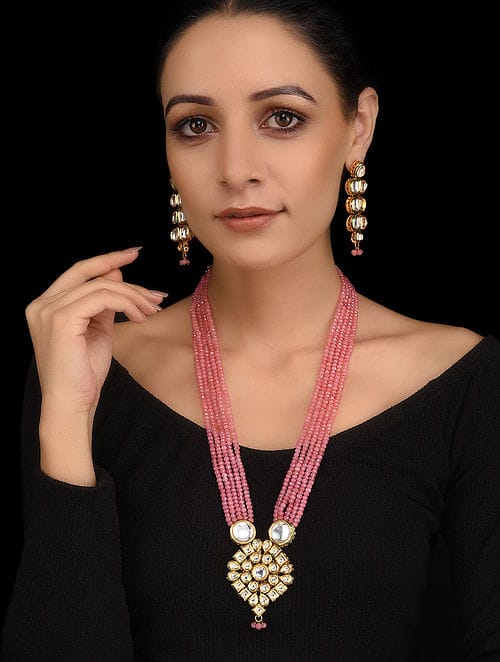 Gold Plated Stones Studded & Beaded Jewellery Set
