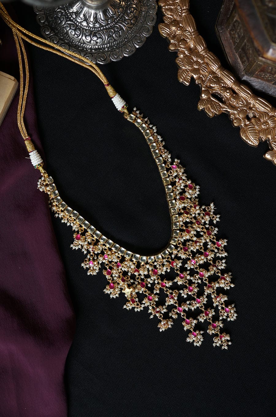 Sabyasachi Inspired Kundan Designer Bridal Long Necklace Set. This exquisite set, designed to reflect the timeless beauty of traditional Indian jewelry, is perfect for brides and special occasions. The set includes a stunning long necklace, matching earrings, and a maangtika, all adorned with intricate Kundan work that exudes luxury and sophistication.