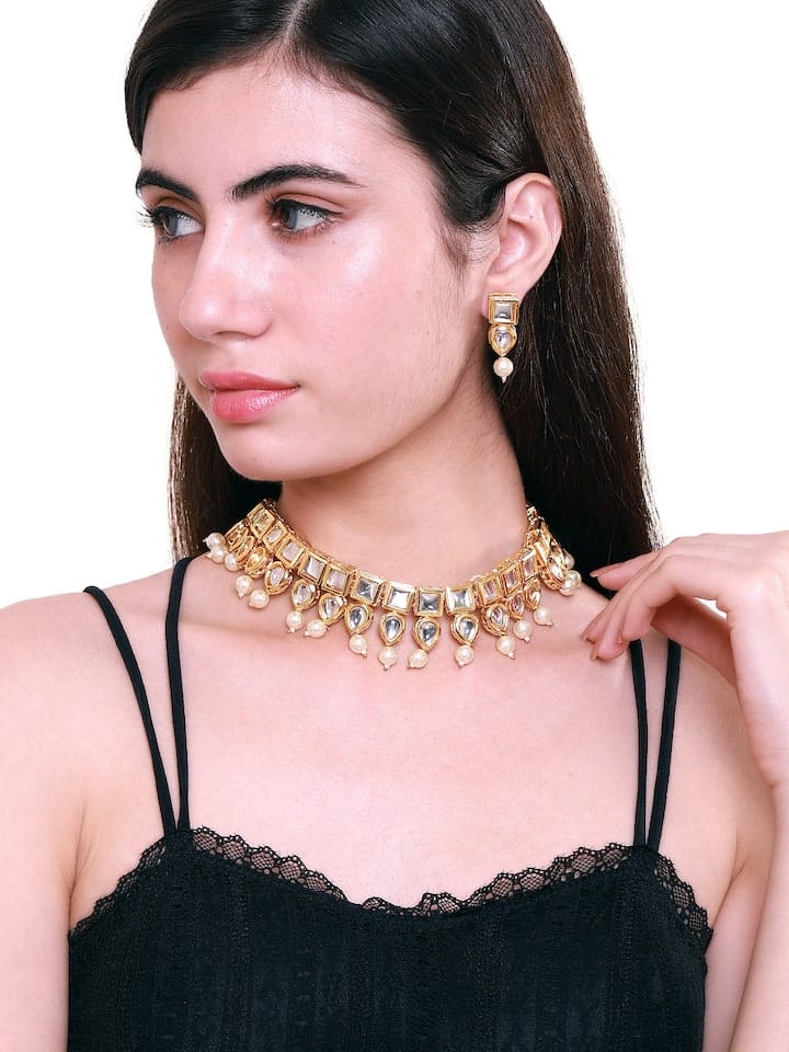 Gold Plated Pearl Studded Choker Necklace & Earrings Set