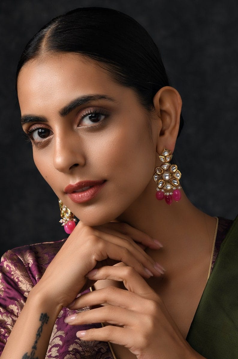 Be the first to review “Royal Indian Beaded Earrings Featuring Dangling Pink Stones And Kundan Arranged In Floral Motif”