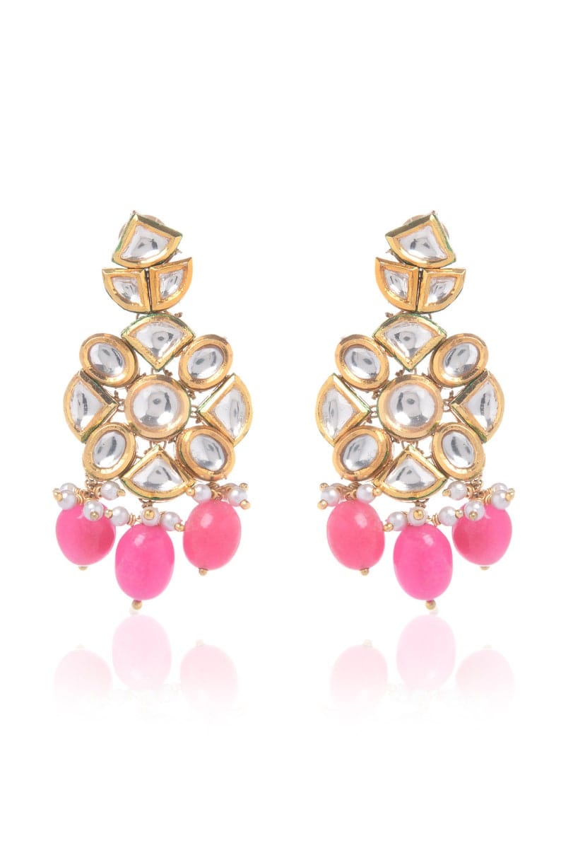 Royal Indian Beaded Earrings Featuring Dangling Pink Stones And Kundan Arranged In Floral Motif