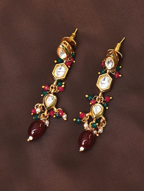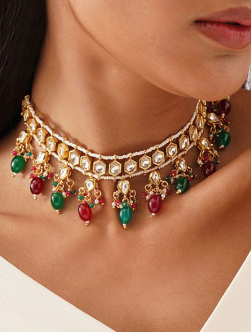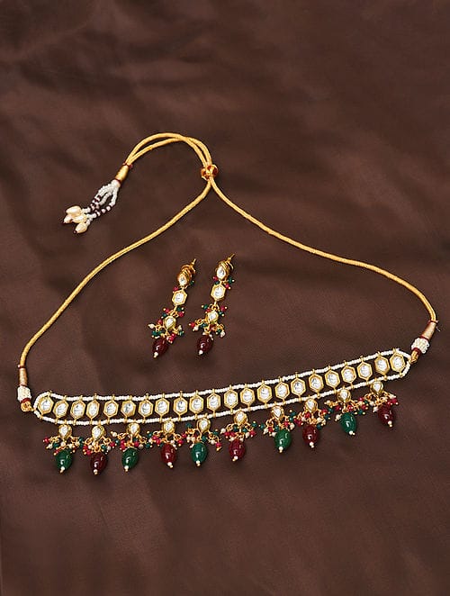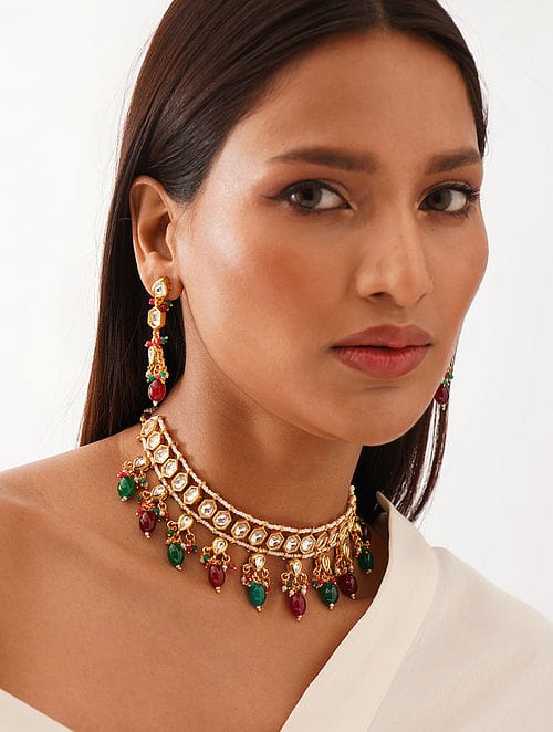 Gold Plated Stones Studded & Beaded Jewellery Set