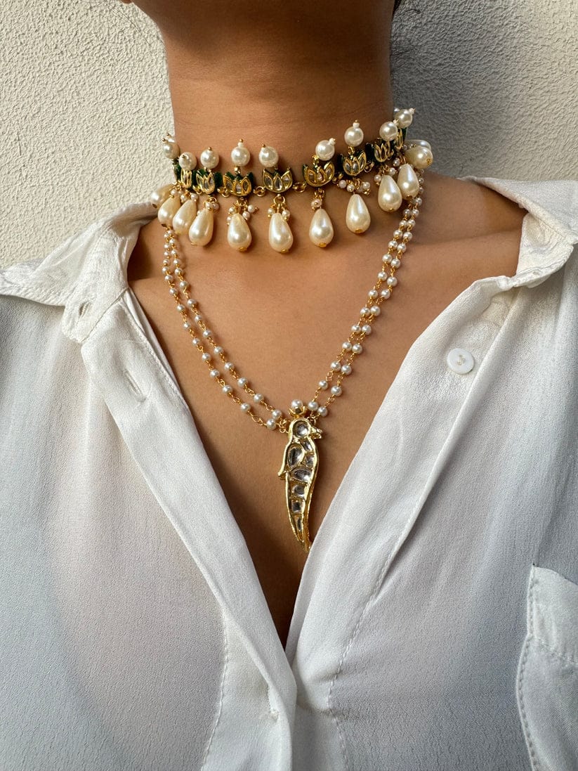Green Fresh Water Pearls Stones Embellished Multi Layered Necklace