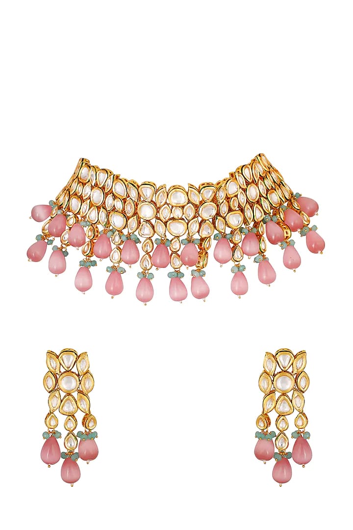 Gold Plated Pearl Studded Choker Necklace & Earrings Set