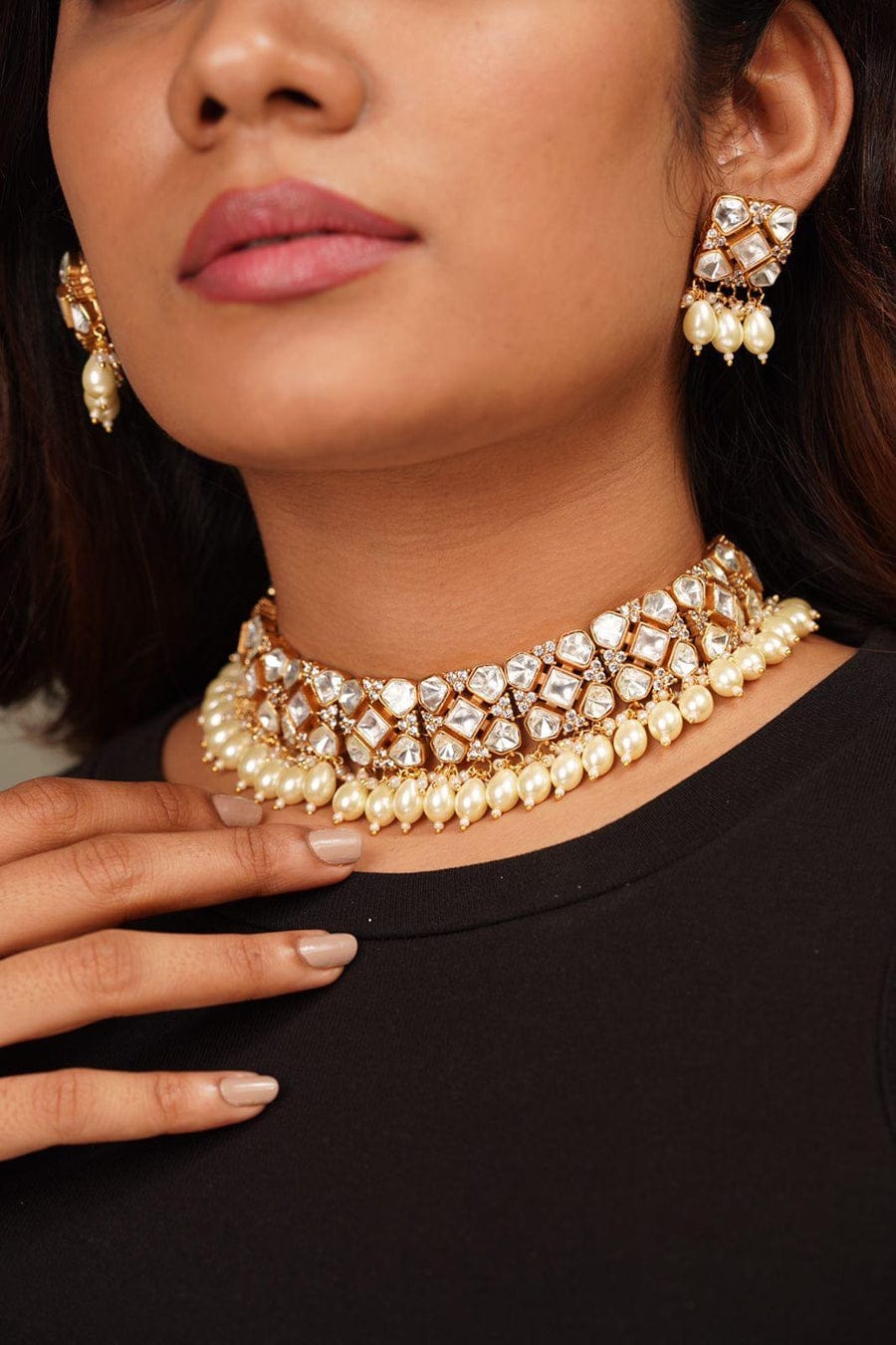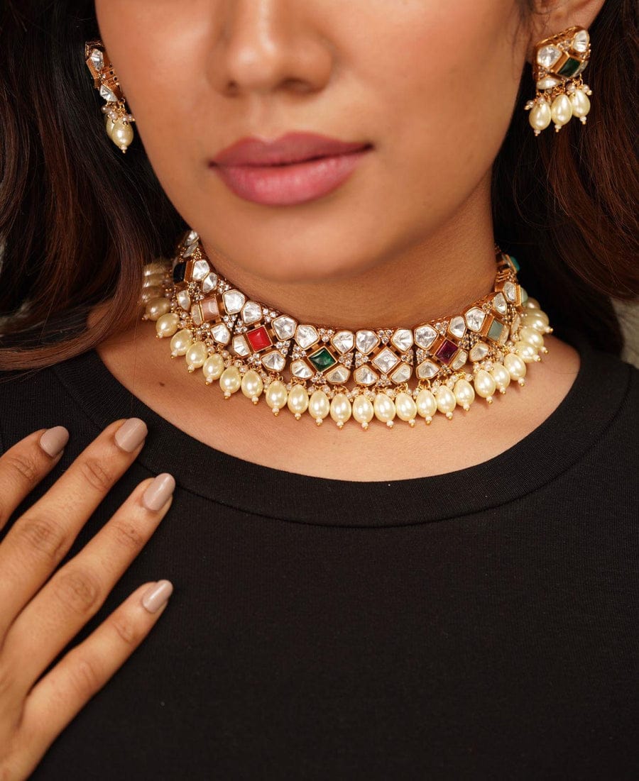 Designer Pearl Beaded Kundan Choker Necklace With Earrings