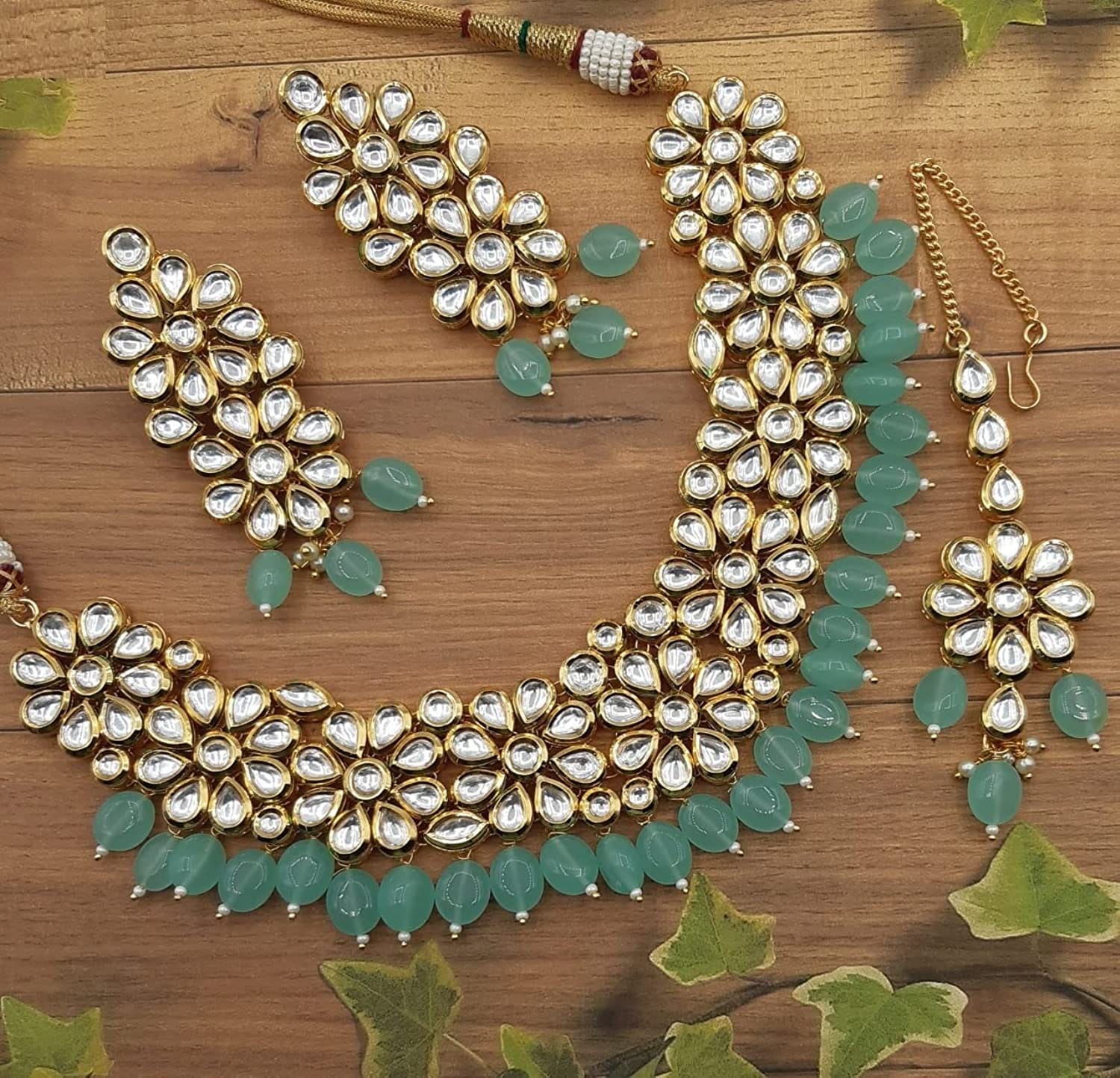 Gold Plated Stones Studded & Beaded Jewellery Set